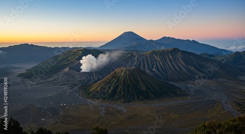 A majestic volcanic landscape at sunrise, featuring steaming craters and rugged terrain. The towering peaks contrast with the vast valley, creating a breathtaking and dramatic natural scene.