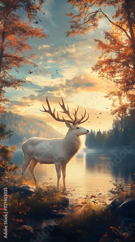 A majestic white deer with perfect antlers, beautiful view of forest and lake in the afternoon at sunset