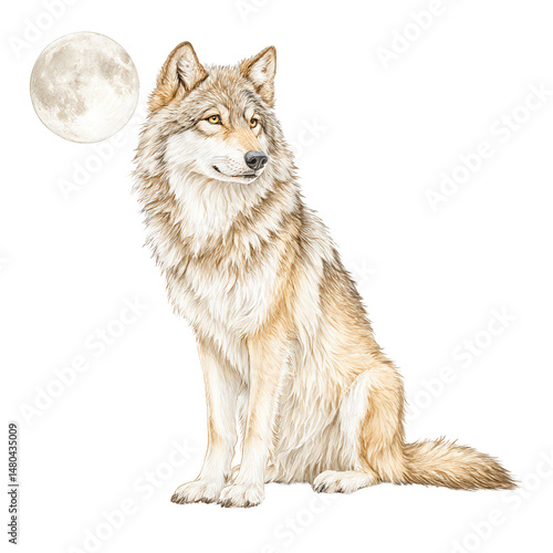 A majestic wolf sits beneath a full moon, gazing wistfully into the distance.