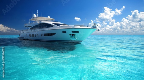 A Majestic Yacht Anchored in Pristine Turquoise Waters Under a Brilliant Blue Sky with Fluffy White Clouds Above