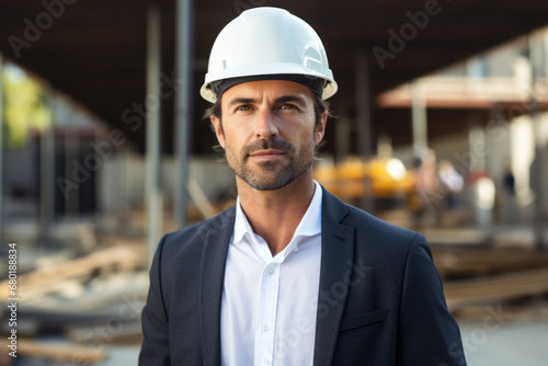 A male architect at a construction project, standing confidently and gazing directly at the camera, professional photography
