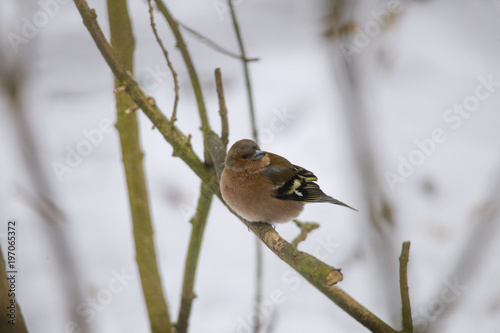 A male chaffinch is sitting on a branch with fluffed plumage on it