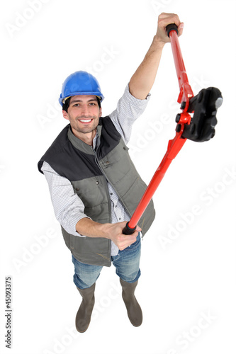 A male construction worker with pliers.