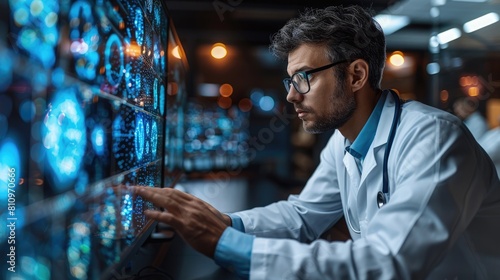 A male doctor in a white coat and glasses is looking at a large screen with brain scans on it.