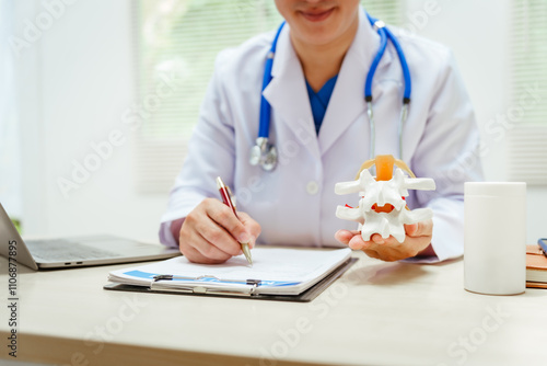 A male doctor wearing glasses sits at a desk, explaining a spine model, discussing spinal anatomy, degenerative diseases, nerve compression, back pain, osteoporosis, muscle weakness,reduced mobility