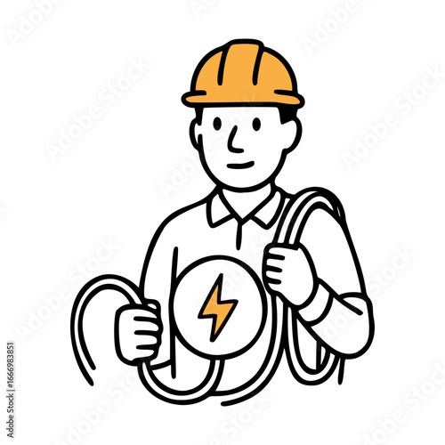 A male electrician wearing a yellow hard hat holds electrical cables and a round device with a lightning symbol. The scene represents electrical work and safety.
