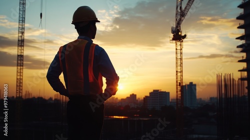 A male engineer standing at construction site to inspect planning work and monitor progress of project construction at construction site on sunset evening