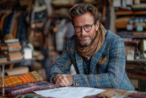 A male fashion designer is stylishly dressed and working at a clothing store, surrounded by fabrics