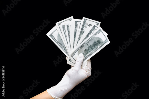 A male hand in a white medical glove holds a fan of a bundle of hundred-dollar banknotes on a black background with copy space.The concept of treatment fees, bribes, illegal surgery and life insurance