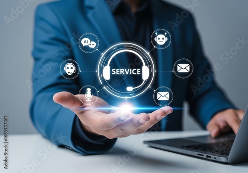 A male in a blue suit extends his hand, showcasing a digital customer service interface with various communication icons.