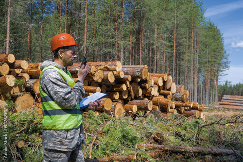 A male leader is talking on a walkie-talkie.