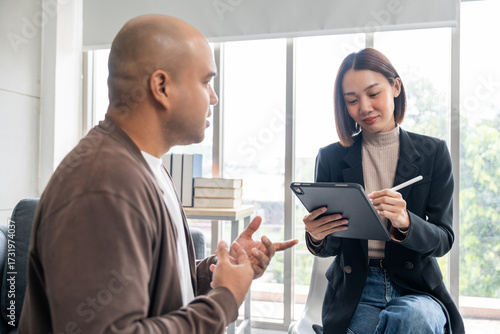 A male mental health patient consults a psychiatrist undergoing therapy and psychological assessments for effective treatment. Psychiatric care participating in mental health evaluations sessions