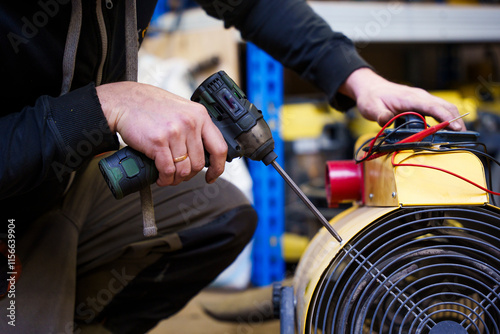 a male repairman repairs industrial electric heaters, he has a tool and a multimeter in his hands