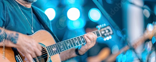 A male singer with an acoustic guitar on blur blue bokeh light background