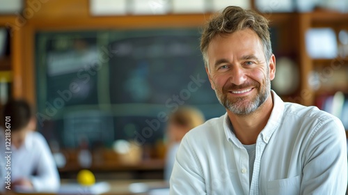 A male teacher stands confidently in a classroom filled with young elementary students. He engages the class with enthusiasm, encouraging participation during lessons