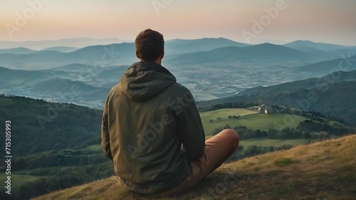 A male tourist sits on a hill and looks into the distance. A man watches the landscape.