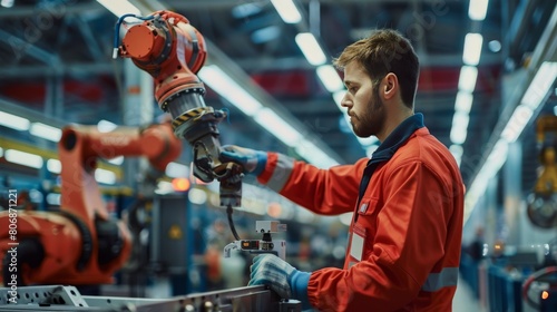 A male worker with a red badge programming a large industrial robot in an automotive assembly line