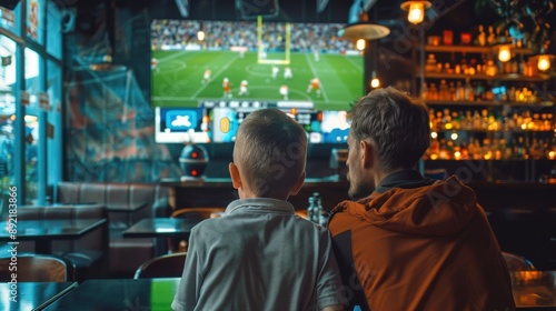 A man and a boy watching a football game on tv