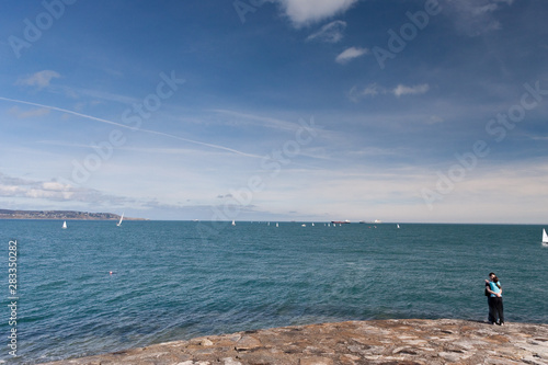 A man and a woman, a couple in love, look at the sea and see off the steep bank of the ocean.