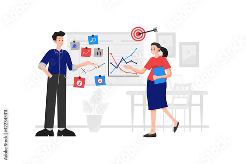 A man and a woman are discussing marketing and standing in front of a table with many sticker notes and line charts