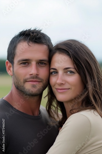 A man and a woman are standing close to each other, smiling. The man is wearing a black shirt and the woman is wearing a tan shirt. Scene is happy and affectionate
