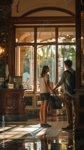 A man and a woman hold hands in a hotel lobby with elegant decor, creating a warm and intimate atmosphere. The man wears yellow, the woman in white and black, showcasing classy interior design.
