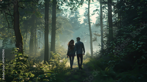 A man and a woman taking a walk in a forested mountain, Generative AI