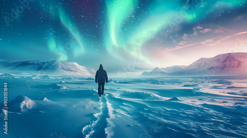 A man and footprint in snow mountain under northern light aurora on winter.
