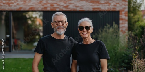 A man and woman are standing in front of a brick house, smiling for the camera. Scene is happy and friendly