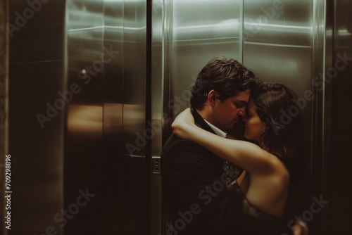 a man and woman kissing one another in an elevator, in the style of celebrity photography, blurred imagery