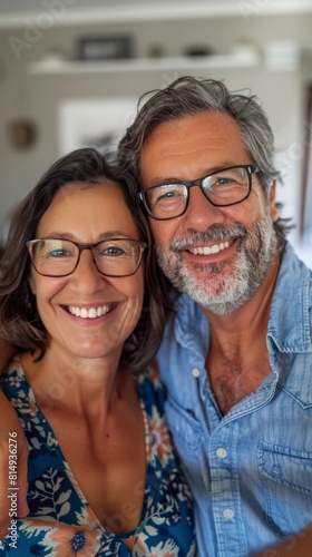 A man and woman with glasses smiling and hugging each other both wearing glasses with the man sporting a beard and the woman wearing a floral top.