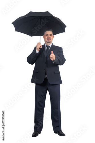 A man businessman in a suit is holding an umbrella, smiling and showing thumbs up!