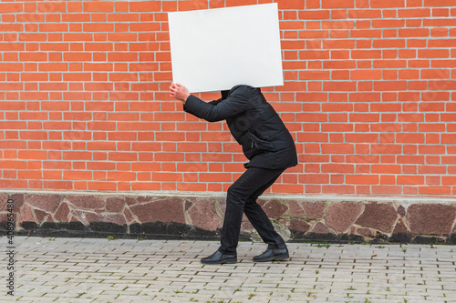A man carries on his shoulder a blank white canvas for painting against a red brick wall