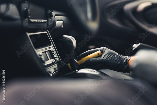 A man cleaning black car interior with a brush. Car detailing concept. Closeup shot with blurred foreground. High quality photo