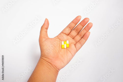 a man consuming three yellow capsules with white isolated