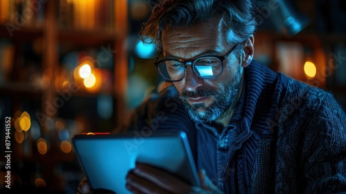 A man, deeply engrossed in his reading, is seen inside a warmly lit indoor space, reflecting an atmosphere of comfort, focus, and modern engagement with technology.