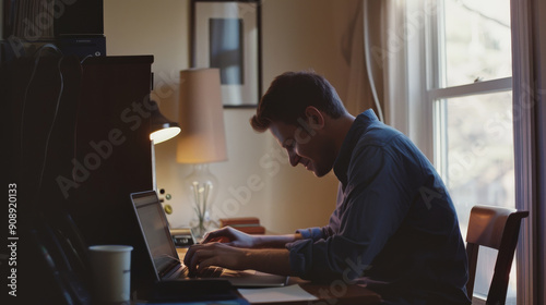 A man diligently works on his laptop in a cozy home office, enveloped by warm light creating a focused, serene atmosphere.