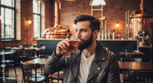 A man drinking beer in a dimly lit, industrial-style bar with exposed brick walls and large windows.