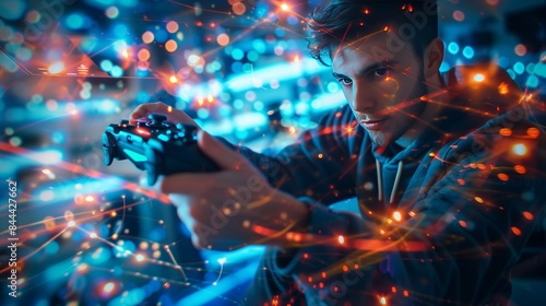 A man engrossed in video games on a high-tech console, surrounded by vibrant, dynamic LED lights.