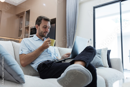 A man enjoys a relaxing moment at home, sipping coffee and working on his laptop while lounging on a comfortable sofa in a modern, bright living space with natural light and calm surroundings.