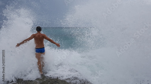 a man enters the raging sea