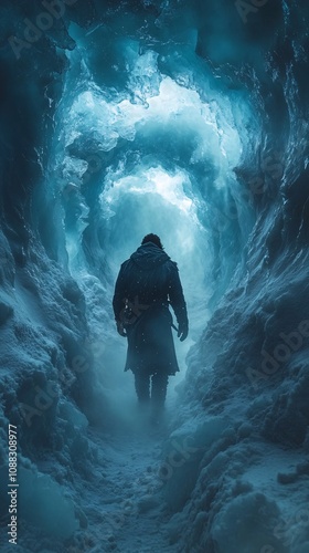 a man falling through an ice tunnel. Ice tunnel background, winter theme.