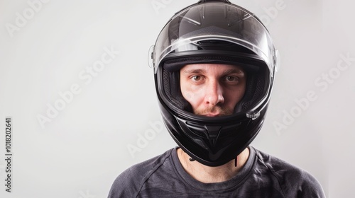 A man gazes confidently at the camera, wearing a sleek black motorcycle helmet against a minimalist background, suggesting adventure and safety.