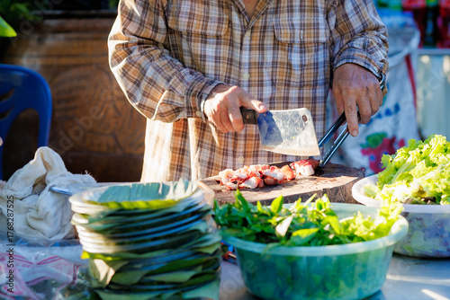 A man grills pork in a crispy, fragrant pot at a party. The crispy pork chops are a popular dish in Thailand.
