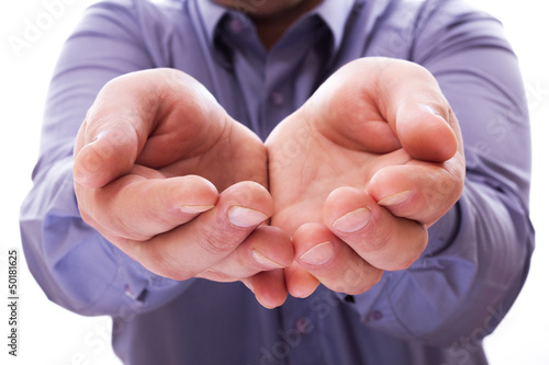 A man holds a handful, hands together, asks
