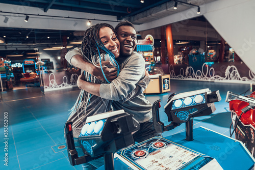 A man hugs his girlfriend who won a video game.