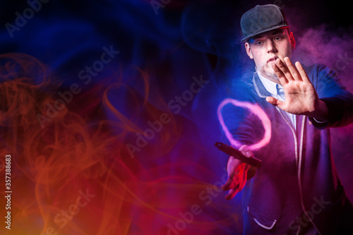 A man in a baseball cap lets out a smoke ring from an e-cigarette. Smoking concept. Fashionable entertainment. VAPE Smoking. Gadgets for Smoking electronic cigarettes. VAPE shop.