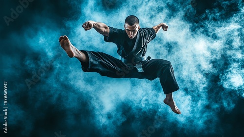 A man in a black karate uniform, with a black belt, is performing a powerful kick with smoke behind him.