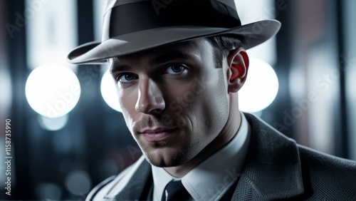 A man in a black suit and hat stands in front of the camera and looks into it close-up