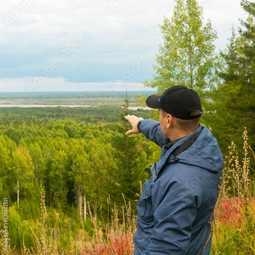 a man in a blue jacket and a black cap on a wooded hill against the background of a forest and a river shows his hand into the distance